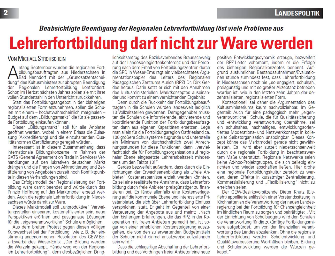 Michael Strohschein: "Lehrerfortbildung darf nicht zur Ware werden!"