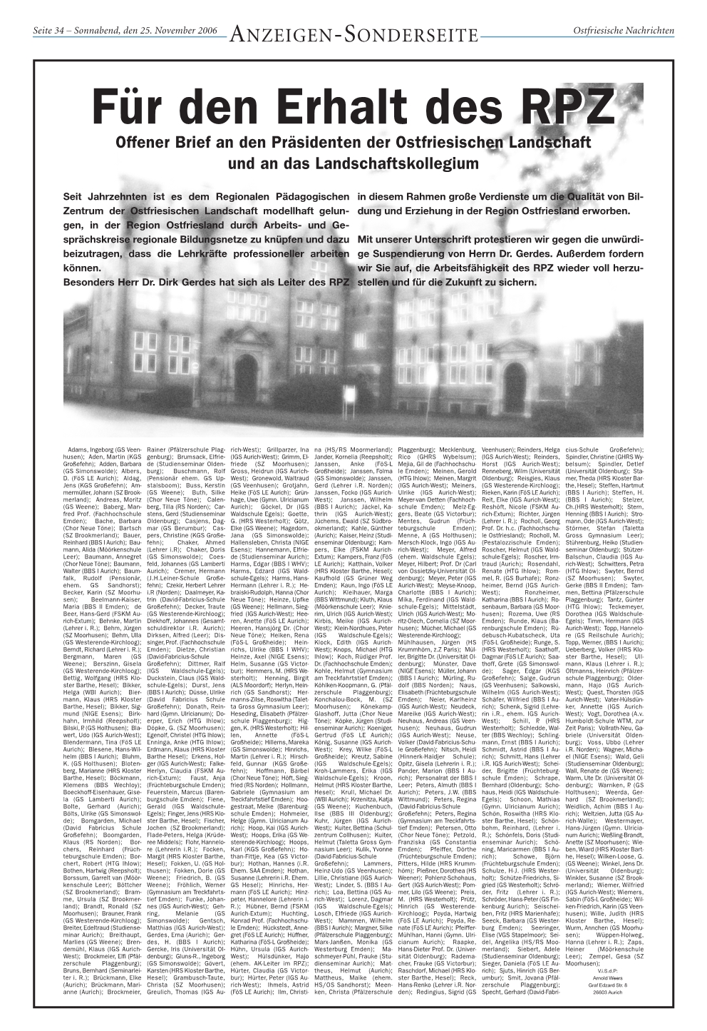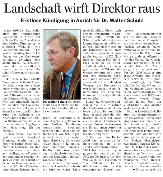 (Der folgende Text wurde seinerzeit an die Mitglieder des Bildungsausschusses der Ostfriesischen Landschaft und die RPZ-LehrerInnen verteilt und führte in der weiteren Abfolge zur Suspendierung des RPZ-Leiters. Der kurzzeitige Landschaftsdirektor Schulz leistete sich in der Folge viele weitere Konflikte, bis die Aufsichtsgremien, schlussendlich sogar sein Bewunderer, Landschaftspräsident Helmut Collmann, diesen erratischen Macht- und Profilierungsspielen durch Entlassung ein Ende setzten. Bis es soweit war, war allerdings bereits viel Porzellan zerschlagen worden....)